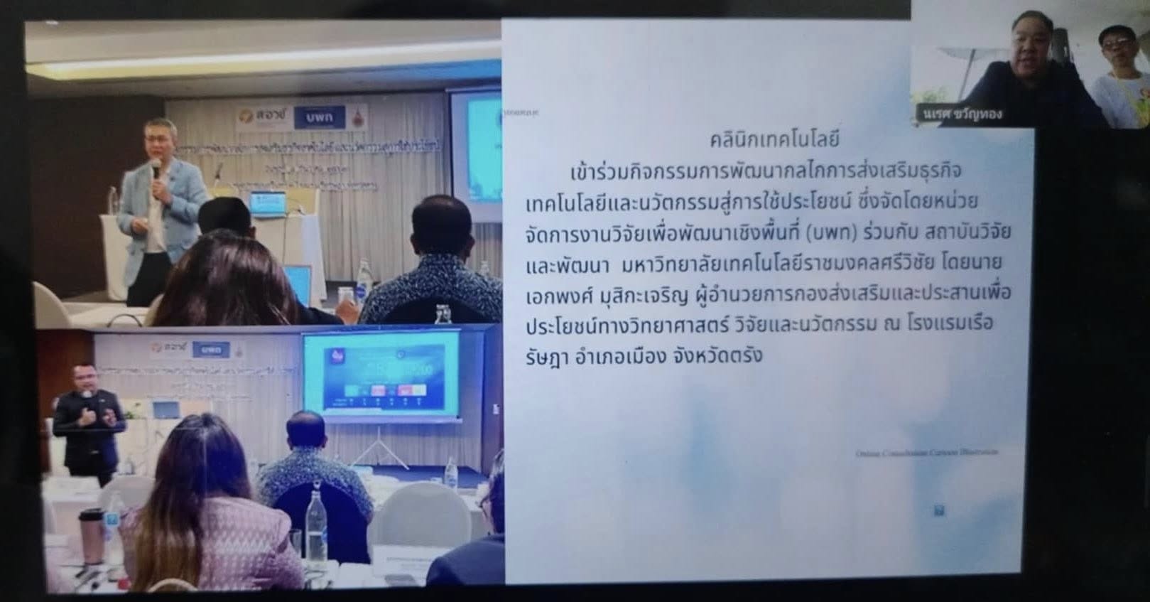 วันที่ 21 มกราคม 2569 คลินิกเทคโนโลยี มหาวิทยาลัยเทคโนโลยีราชมงคลศรีวิชัย วิทยาเขตตรัง นำโดย ผู้ช่วยศาสตราจารย์นเรศ ขวัญทอง ผู้จัดการคลินิกเทคโนโลยี เข้าร่วมนำเสนอผลการดำเนินงานโครงการบริการให้คำปรึกษาและข้อมูลเทคโนโลยีเพื่อยกระดับคุณภาพชีวิตด้วยเทคโนโลยีและนวัตกรรม ประจำปีงบประมาณ พ.ศ. 2568 ในโครงการติดตามและประเมินผลการดำเนินโครงการภายใต้กิจกรรมการส่งเสริมการนำวิทยาศาสตร์เทคโนโลยีและนวัตกรรม (วทน.) เพื่อเพิ่มศักยภาพการผลิตและเศรษฐกิจชุมชน ปีงบประมาณ พ.ศ. 2568 ของสำนักงานปลัดกระทรวงการอุดมศึกษา วิทยาศาสตร์ วิจัยและนวัตกรรม (สป.อว.) ซึ่งได้มอบหมายให้คณะสิ่งแวดล้อมและทรัพยากรศาสตร์ มหาวิทยาลัยมหิดล โดยมีศาสตราจารย์ ดร.นาฏสุดา ภูมิจำนงค์ เป็นผู้รับผิดชอบโครงการ รายงานโดย ผศ.นเรศ ขวัญทอง วันที่รายงาน 05/04/2569 [21557] |