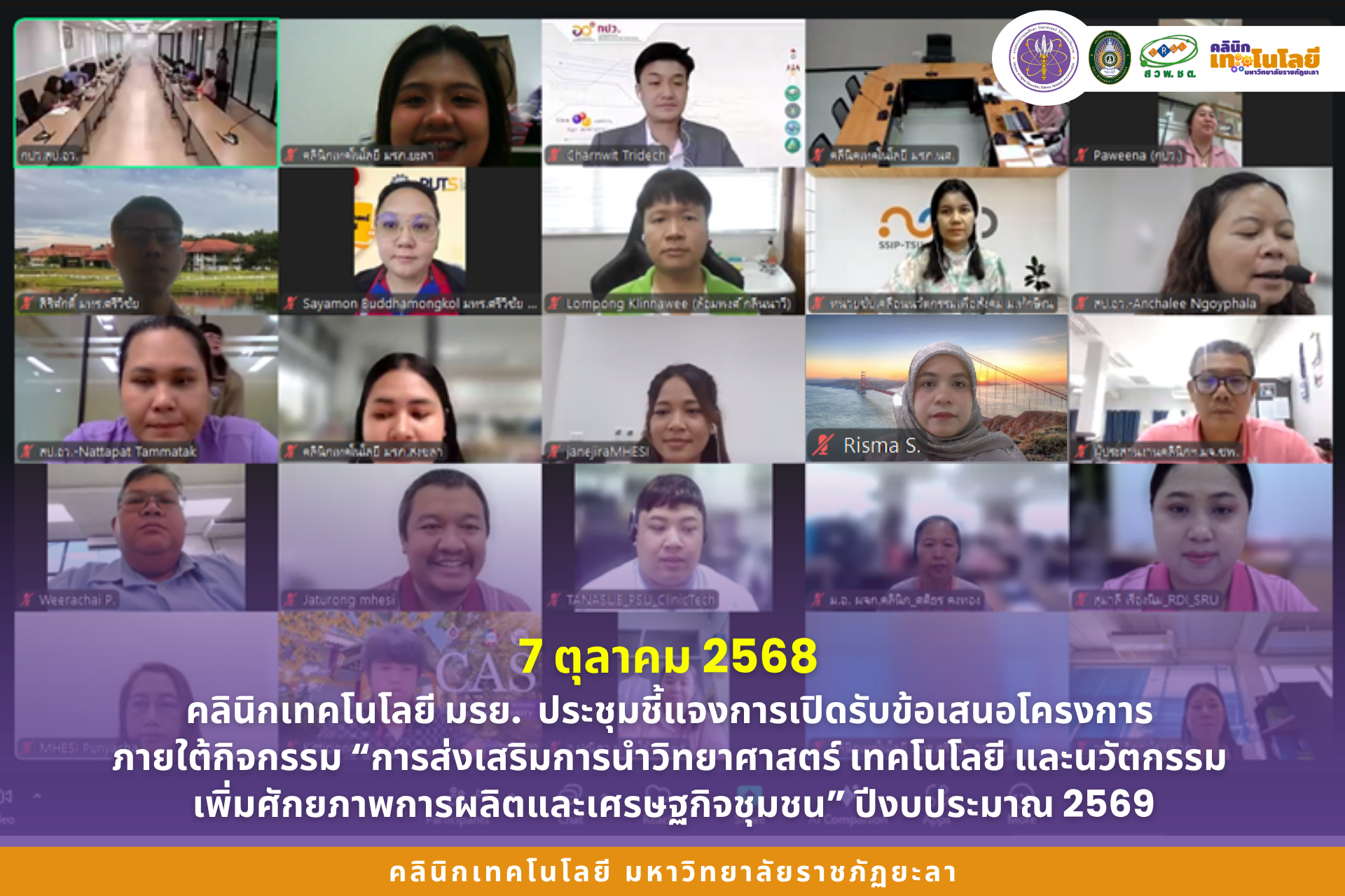 วันที่ 7 ตุลาคม 2568 เวลา 10.00 น. คลินิกเทคโนโลยี มหาวิทยาลัยราชภัฏยะลา โดยนางสาวริซมา สาเม๊าะ หัวหน้างานพัฒนาทรัพยากรมนุษย์ และนางสาวลักษ์ขณาวดี ชุ่มแก้ว เจ้าหน้าที่บริหารงานทั่วไป คลินิกเทคโนโลยี เข้าร่วมประชุมชี้แจงการเปิดรับข้อเสนอโครงการ ภายใต้กิจกรรม “การส่งเสริมการนำวิทยาศาสตร์ เทคโนโลยี และนวัตกรรม เพิ่มศักยภาพการผลิตและเศรษฐกิจชุมชน” ปีงบประมาณ 2569 จัดโดยกองส่งเสริมและประสานเพื่อประโยชน์ทางวิทยาศาสตร์ วิจัยและนวัตกรรม (กปว.) สำนักงานปลัดกระทรวงการอุดมศึกษา วิทยาศาสตร์ วิจัยและนวัตกรรม (สป.อว.) ซึ่ง ดร.ชาญวิทย์ ตรีเดช ผู้อำนวยการกลุ่มส่งเสริมธุรกิจเทคโนโลยีและนวัตกรรม พร้อมเจ้าหน้าที่ชี้แจงการเปิดรับข้อเสนอโครงการดังกล่าว ทั้งนี้มีผู้แทนคลินิกเทคโนโลยีเครือข่าย นักวิจัย อาจารย์ และผู้ประสานงานเครือข่ายภาคใต้ เข้าร่วมผ่าน Zoom Cloud Meeting กว่า 200 คน
