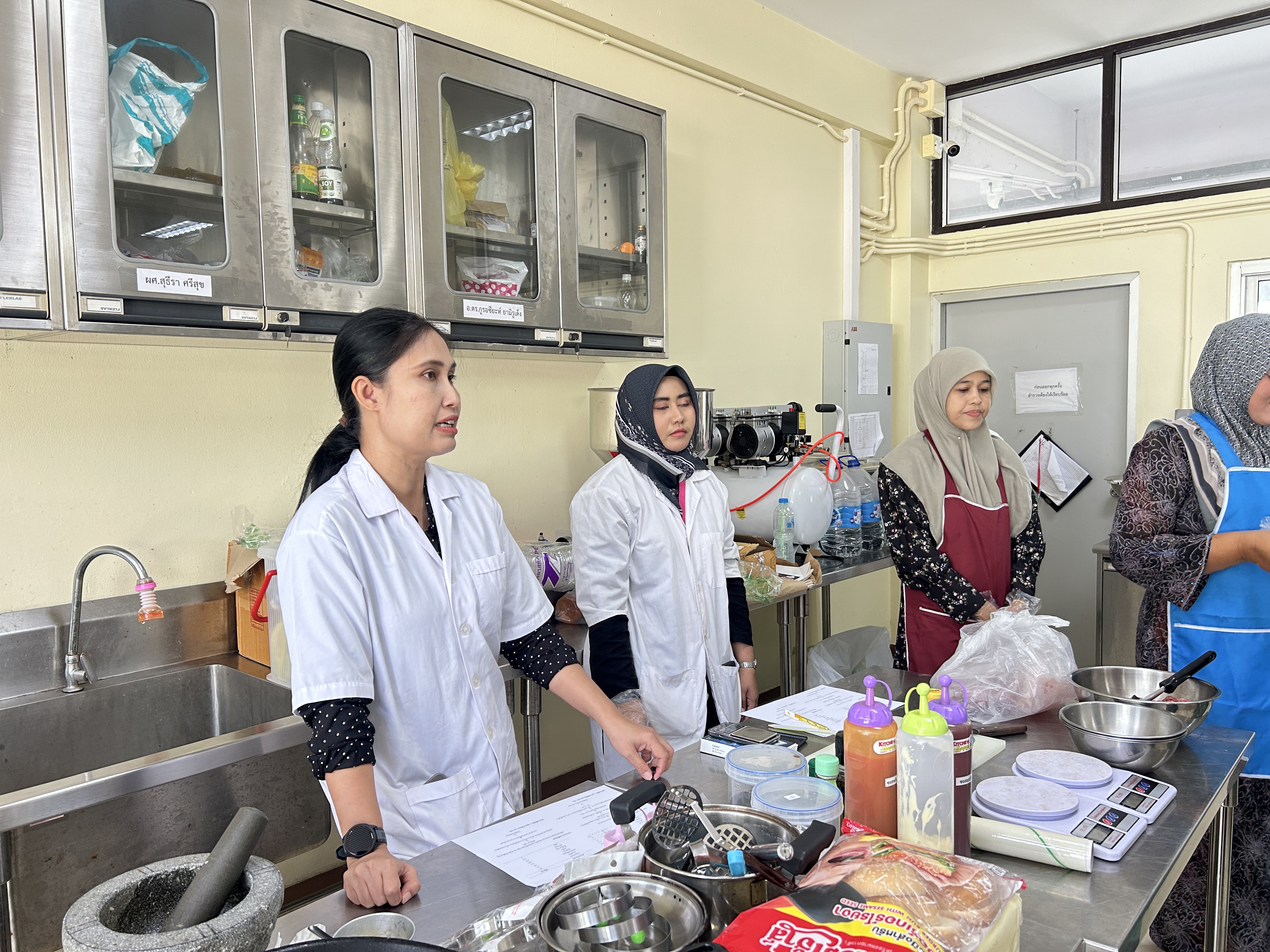 วันที่ 12 พฤศจิกายน 2568 ผู้ช่วยศาสตราจารย์กมลทิพย์ กรรไพเราะ หัวหน้าโครการการออกแบบบรรจุภัณฑ์เนื้อสไลด์และพัฒนาผลิตภัณฑ์เนื้อเบอร์เกอร์พร้อมซอส ภายใต้โครงการพัฒนาผลิตภัณฑ์สินค้าชุมชน (แนวทางคูปองวิทย์เพื่อโอทอป) ประจำปีงบประมาณ พ.ศ.2568 พร้อมด้วยผู้ช่วยวิจัย นางสาวพาตีเม๊าะ โต๊ะแว และนางสาวอามีเนาะ สาเม๊าะ จัดอบรมเชิงปฏิบัติการกระบวนการผลิตผลิตภัณฑ์เนื้อเบอร์เกอร์พร้อมซอส ให้กับกลุ่มวิสาหกิจชุมชนเกษตรกรเลี้ยงโคเนื้อบ้านนิบง อำเภอกาบัง จังหวัดยะลา ณ อาคาร 3 ตึกวิทยาศาสตร์ฮาลาล มหาวิทยาลัยราชภัฏยะลา