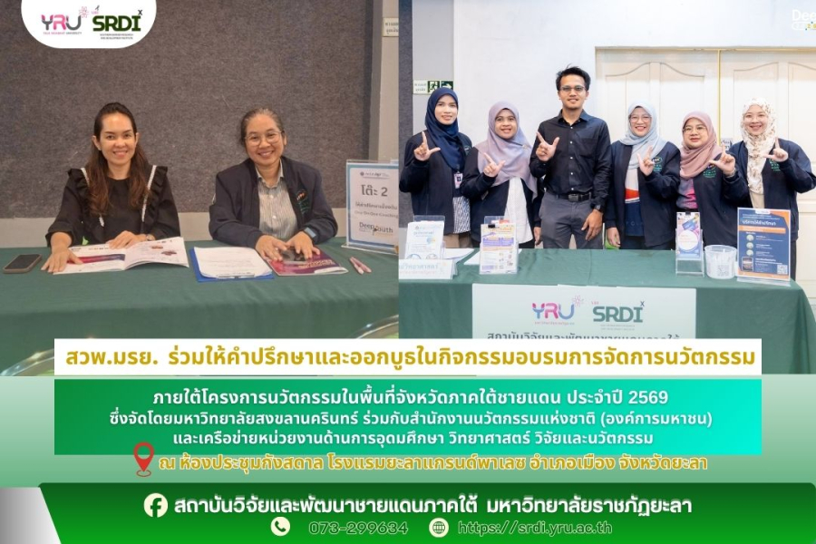 วันที่ 24 ธันวาคม 2568 สถาบันวิจัยและพัฒนาชายแดนภาคใต้ มหาวิทยาลัยราชภัฏยะลา นำโดย รองศาสตราจารย์ ดร.ชินีเพ็ญ มะลิสุวรรณ ผู้อำนวยการสถาบันวิจัยฯ  ผู้ช่วยศาสตราจารย์ ดร. สุรเดช มัจฉาเวช รองผู้อำนวยการสถาบันวิจัยฯ อาจารย์ ดร.ภัทรวดี เอียดเต็ม รองผู้อำนวยการสถาบันวิจัยฯ และเจ้าหน้าที่บุคลากรสถาบันวิจัยฯ เข้าร่วมเป็นที่ปรึกษาเพื่อให้คำปรึกษาและออกบูธแนะนำการให้บริการของมหาวิทยาลัยราชภัฏยะลา ในการพัฒนาโครงการนวัตกรรมเบื้องต้น
