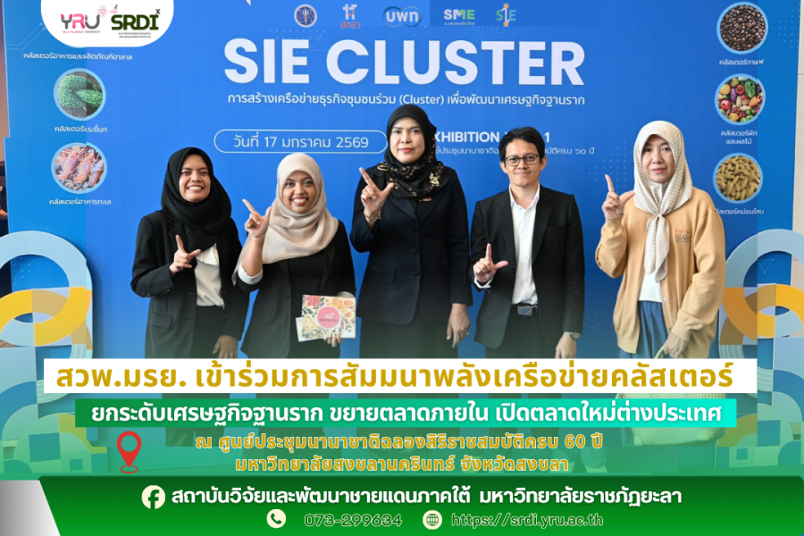 วันที่ 17 มกราคม 2569 สถาบันวิจัยและพัฒนาชายแดนภาคใต้ มหาวิทยาลัยราชภัฏยะลา นำโดย ผู้ช่วยศาสตราจารย์ ดร.เกสรี ลัดเลีย รองอธิการบดีฝ่ายวิจัยและนวัตกรรม พร้อมด้วย ผู้ช่วยศาสตราจารย์ ดร.ปาวีณา ดุลยเสรี ผู้ช่วยผู้อำนวยการสถาบันวิจัยฯ คณะนักวิจัยและบุคลากรสถาบันวิจัยฯ เข้าร่วมการสัมมนา “พลังเครือข่ายคลัสเตอร์ ยกระดับเศรษฐกิจฐานราก ขยายตลาดภายใน เปิดตลาดใหม่ต่างประเทศ” ในหัวข้อ Special Talk with 3 Key Partners ณ ศูนย์ประชุมนานาชาติฉลองสิริราชสมบัติครบ 60 ปี มหาวิทยาลัยสงขลานครินทร์ จังหวัดสงขลา เพื่อแลกเปลี่ยนองค์ความรู้และสร้างเครือข่ายความร่วมมือด้านการพัฒนาเศรษฐกิจฐานรากอย่างยั่งยืน