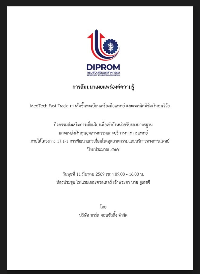 กิจกรรมที่ 15 วันเสาร์ที่ 11 มีนาคม 2569 ( การเข้าร่วมกิจกรรม กัหบหน่วยงานภายนอก) ความเป็นมาและการดำเนินงาน เจ้าหน้าที่คลินิกเทคโนโลยี มหาวิทยาลัยเทคโนโลยีพระจอมเกล้าธนบุรี เข้าร่วมอบรมในหัวข้อ “MedTech Fast Track และแนวทางการขึ้นทะเบียนเครื่องมือแพทย์” ภายใต้โครงการพัฒนาศักยภาพด้านการจัดเตรียมเอกสารคำขอขึ้นทะเบียนผลิตภัณฑ์เครื่องมือแพทย์รูปแบบ Full CSDTการอบรมจัดขึ้นเมื่อวันที่ 13 มีนาคม 2569 ณ ห้องประชุม โรงแรมเดอะควอเตอร์ เจ้าพระยา บาย ยูเอชจี โดยเน้นเนื้อหาด้านกฎหมาย กฎระเบียบ และขั้นตอนการยื่นคำขอขึ้นทะเบียนเครื่องมือแพทย์ รวมถึงแนวทางการสนับสนุนนวัตกรรมผ่านกลไก MedTech Fast Track ผลการดำเนินงาน การเข้าร่วมกิจกรรมครั้งนี้ช่วยเสริมสร้างองค์ความรู้และความเข้าใจด้านกฎหมายและกระบวนการขึ้นทะเบียนเครื่องมือแพทย์ ซึ่งเป็นประโยชน์ต่อการให้คำปรึกษาแก่ผู้ประกอบการในกลุ่มอุตสาหกรรมเครื่องมือแพทย์ได้อย่างมีประสิทธิภาพมากยิ่งขึ้น โดยองค์ความรู้ที่ได้รับสามารถนำไปต่อยอดในการสนับสนุนผู้ประกอบการให้สามารถพัฒนาผลิตภัณฑ์เข้าสู่กระบวนการขึ้นทะเบียนได้อย่างถูกต้องและรวดเร็ว รายงานโดย ผศ.ดร.ทัศวัลย์ คัมภีระพันธุ์ วันที่รายงาน 05/04/2569 [21564] |