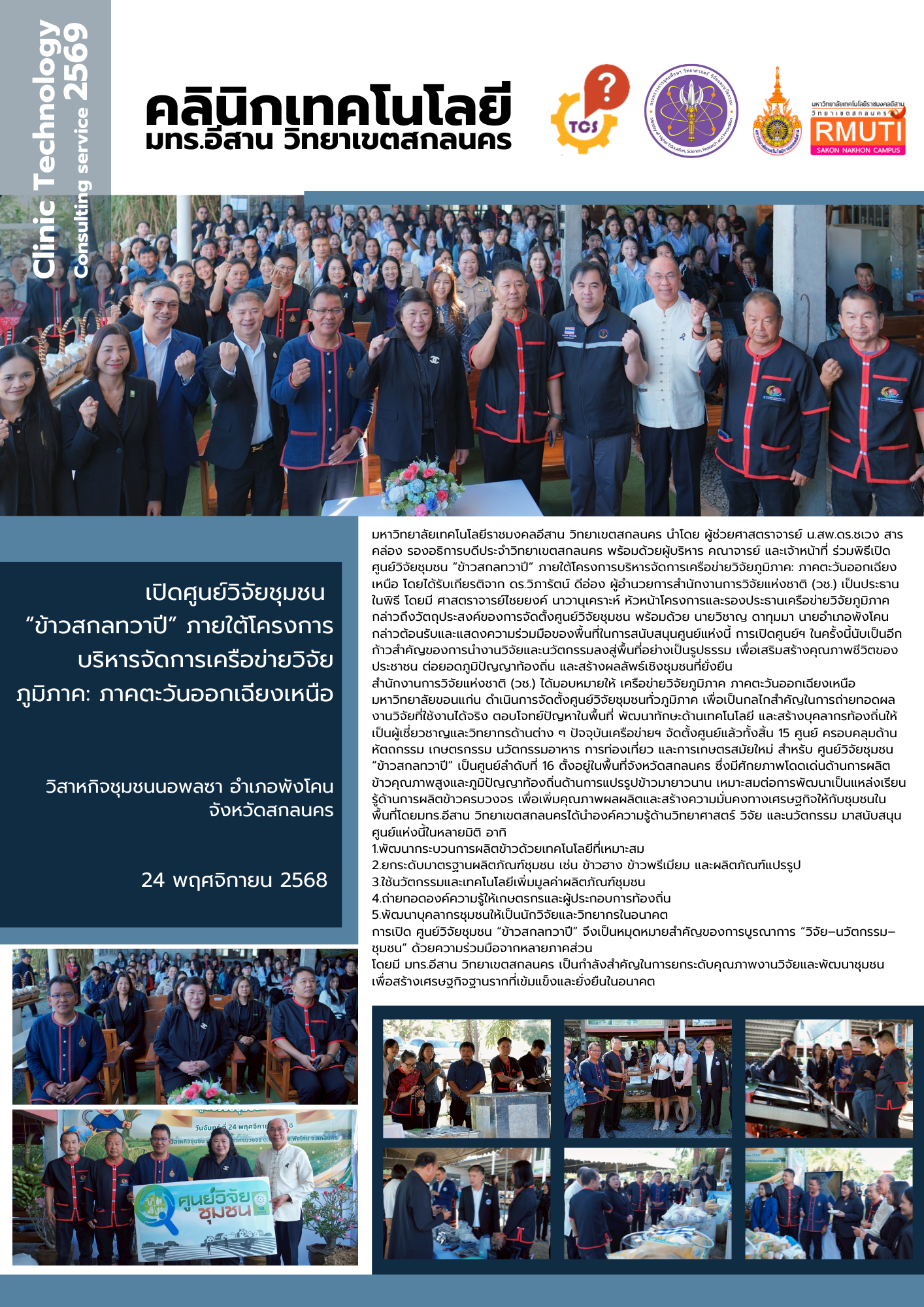 การเปิด ศูนย์วิจัยชุมชน “ข้าวสกลทวาปี” จึงเป็นหมุดหมายสำคัญของการบูรณาการ “วิจัย–นวัตกรรม–ชุมชน” ด้วยความร่วมมือจากหลายภาคส่วนโดยมี มทร.อีสาน วิทยาเขตสกลนคร เป็นกำลังสำคัญในการยกระดับคุณภาพงานวิจัยและพัฒนาชุมชน เพื่อสร้างเศรษฐกิจฐานรากที่เข้มแข็งและยั่งยืนในอนาคต