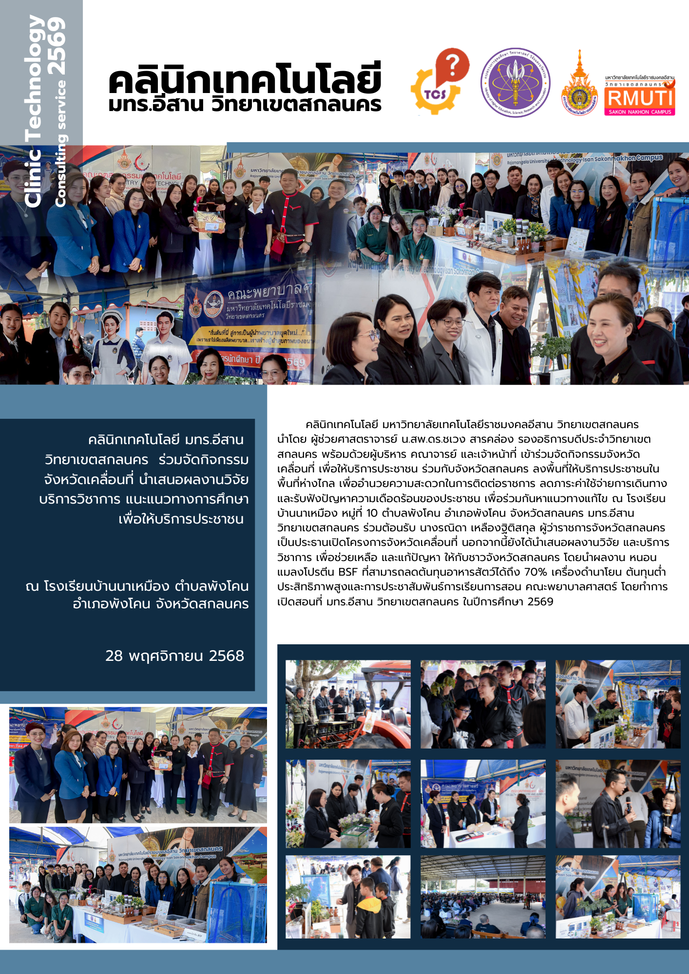คลินิกเทคโนโลยี มหาวิทยาลัยเทคโนโลยีราชมงคลอีสาน วิทยาเขตสกลนคร นำโดย ผู้ช่วยศาสตราจารย์ น.สพ.ดร.ชเวง สารคล่อง รองอธิการบดีประจำวิทยาเขตสกลนคร พร้อมด้วยผู้บริหาร คณาจารย์ และเจ้าหน้าที่ เข้าร่วมจัดกิจกรรมจังหวัดเคลื่อนที่ เพื่อให้บริการประชาชน ร่วมกับจังหวัดสกลนคร ลงพื้นที่ให้บริการประชาชนในพื้นที่ห่างไกล เพื่ออำนวยความสะดวกในการติดต่อราชการ ลดภาระค่าใช้จ่ายการเดินทาง และรับฟังปัญหาความเดือดร้อนของประชาชน เพื่อร่วมกันหาแนวทางแก้ไข ณ โรงเรียนบ้านนาเหมือง หมู่ที่ 10 ตำบลพังโคน อำเภอพังโคน จังหวัดสกลนคร มทร.อีสาน วิทยาเขตสกลนคร ร่วมต้อนรับ นางรณิดา เหลืองฐิติสกุล ผู้ว่าราชการจังหวัดสกลนคร เป็นประธานเปิดโครงการจังหวัดเคลื่อนที่ นอกจากนี้ยังได้นำเสนอผลงานวิจัย และบริการวิชาการ เพื่อช่วยเหลือ และแก้ปัญหา ให้กับชาวจังหวัดสกลนคร โดยนำผลงาน หนอนแมลงโปรตีน BSF ที่สามารถลดต้นทุนอาหารสัตว์ได้ถึง 70% เครื่องดำนาโยน ต้นทุนต่ำประสิทธิภาพสูงและการประชาสัมพันธ์การเรียนการสอน คณะพยาบาลศาสตร์ โดยทำการเปิดสอนที่ มทร.อีสาน วิทยาเขตสกลนคร ในปีการศึกษา 2569