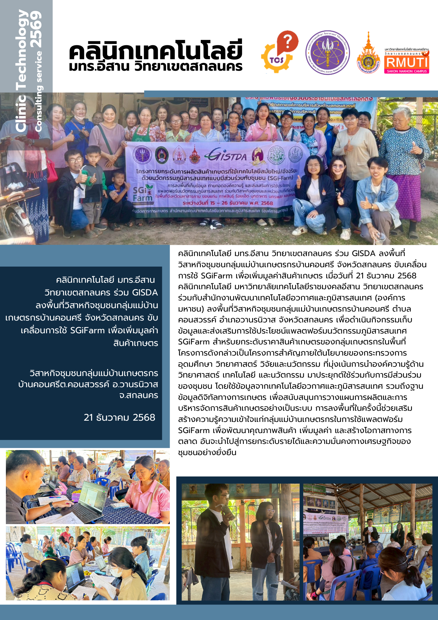 คลินิกเทคโนโลยี มทร.อีสาน วิทยาเขตสกลนคร ร่วม GISDA ลงพื้นที่วิสาหกิจชุมชนกลุ่มแม่บ้านเกษตรกรบ้านคอนศรี จังหวัดสกลนคร ขับเคลื่อนการใช้ SGiFarm เพื่อเพิ่มมูลค่าสินค้าเกษตร ณ วิสาหกิจชุมชนกลุ่มแม่บ้านเกษตรกร บ้านคอนศรีต.คอนสวรรค์ อ.วานรนิวาส จ.สกลนคร คลินิกเทคโนโลยี มทร.อีสาน วิทยาเขตสกลนคร ร่วม GISDA ลงพื้นที่วิสาหกิจชุมชนกลุ่มแม่บ้านเกษตรกรบ้านคอนศรี จังหวัดสกลนคร ขับเคลื่อนการใช้ SGiFarm เพื่อเพิ่มมูลค่าสินค้าเกษตร เมื่อวันที่ 21 ธันวาคม 2568 คลินิกเทคโนโลยี มหาวิทยาลัยเทคโนโลยีราชมงคลอีสาน วิทยาเขตสกลนคร ร่วมกับสำนักงานพัฒนาเทคโนโลยีอวกาศและภูมิสารสนเทศ (องค์การมหาชน) ลงพื้นที่วิสาหกิจชุมชนกลุ่มแม่บ้านเกษตรกรบ้านคอนศรี ตำบลคอนสวรรค์ อำเภอวานรนิวาส จังหวัดสกลนคร เพื่อดำเนินกิจกรรมเก็บข้อมูลและส่งเสริมการใช้ประโยชน์แพลตฟอร์มนวัตกรรมภูมิสารสนเทศ SGiFarm สำหรับยกระดับราคาสินค้าเกษตรของกลุ่มเกษตรกรในพื้นที่ โครงการดังกล่าวเป็นโครงการสำคัญภายใต้นโยบายของกระทรวงการอุดมศึกษา วิทยาศาสตร์ วิจัยและนวัตกรรม ที่มุ่งเน้นการนำองค์ความรู้ด้านวิทยาศาสตร์ เทคโนโลยี และนวัตกรรม มาประยุกต์ใช้ร่วมกับการมีส่วนร่วมของชุมชน โดยใช้ข้อมูลจากเทคโนโลยีอวกาศและภูมิสารสนเทศ รวมถึงฐานข้อมูลดิจิทัลทางการเกษตร เพื่อสนับสนุนการวางแผนการผลิตและการบริหารจัดการสินค้าเกษตรอย่างเป็นระบบ การลงพื้นที่ในครั้งนี้ช่วยเสริมสร้างความรู้ความเข้าใจแก่กลุ่มแม่บ้านเกษตรกรในการใช้แพลตฟอร์ม SGiFarm เพื่อพัฒนาคุณภาพสินค้า เพิ่มมูลค่า และสร้างโอกาสทางการตลาด อันจะนำไปสู่การยกระดับรายได้และความมั่นคงทางเศรษฐกิจของชุมชนอย่างยั่งยืน