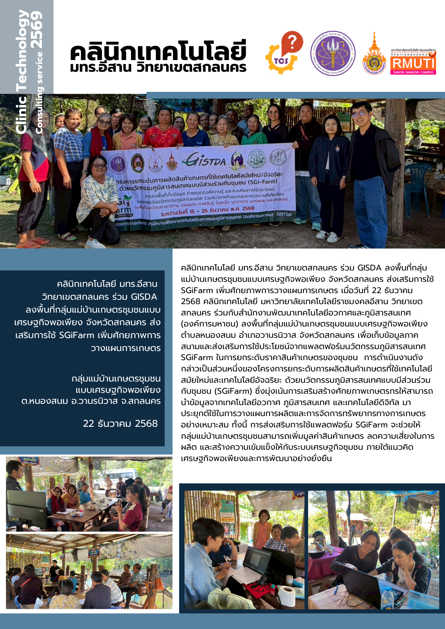 คลินิกเทคโนโลยี มทร.อีสาน วิทยาเขตสกลนคร ร่วม GISDA ลงพื้นที่กลุ่มแม่บ้านเกษตรชุมชนแบบเศรษฐกิจพอเพียง จังหวัดสกลนคร ส่งเสริมการใช้ SGiFarm เพิ่มศักยภาพการวางแผนการเกษตร ณ กลุ่มแม่บ้านเกษตรชุมชน แบบเศรษฐกิจพอเพียง ต.หนองสนม อ.วานรนิวาส จ.สกลนคร คลินิกเทคโนโลยี มทร.อีสาน วิทยาเขตสกลนคร ร่วม GISDA ลงพื้นที่กลุ่มแม่บ้านเกษตรชุมชนแบบเศรษฐกิจพอเพียง จังหวัดสกลนคร ส่งเสริมการใช้ SGiFarm เพิ่มศักยภาพการวางแผนการเกษตร เมื่อวันที่ 22 ธันวาคม 2568 คลินิกเทคโนโลยี มหาวิทยาลัยเทคโนโลยีราชมงคลอีสาน วิทยาเขตสกลนคร ร่วมกับสำนักงานพัฒนาเทคโนโลยีอวกาศและภูมิสารสนเทศ (องค์การมหาชน) ลงพื้นที่กลุ่มแม่บ้านเกษตรชุมชนแบบเศรษฐกิจพอเพียง ตำบลหนองสนม อำเภอวานรนิวาส จังหวัดสกลนคร เพื่อเก็บข้อมูลภาคสนามและส่งเสริมการใช้ประโยชน์จากแพลตฟอร์มนวัตกรรมภูมิสารสนเทศ SGiFarm ในการยกระดับราคาสินค้าเกษตรของชุมชน  การดำเนินงานดังกล่าวเป็นส่วนหนึ่งของโครงการยกระดับการผลิตสินค้าเกษตรที่ใช้เทคโนโลยีสมัยใหม่และเทคโนโลยีอัจฉริยะ ด้วยนวัตกรรมภูมิสารสนเทศแบบมีส่วนร่วมกับชุมชน (SGiFarm) ซึ่งมุ่งเน้นการเสริมสร้างศักยภาพเกษตรกรให้สามารถนำข้อมูลจากเทคโนโลยีอวกาศ ภูมิสารสนเทศ และเทคโนโลยีดิจิทัล มาประยุกต์ใช้ในการวางแผนการผลิตและการจัดการทรัพยากรทางการเกษตรอย่างเหมาะสม ทั้งนี้ การส่งเสริมการใช้แพลตฟอร์ม SGiFarm จะช่วยให้กลุ่มแม่บ้านเกษตรชุมชนสามารถเพิ่มมูลค่าสินค้าเกษตร ลดความเสี่ยงในการผลิต และสร้างความเข้มแข็งให้กับระบบเศรษฐกิจชุมชน ภายใต้แนวคิดเศรษฐกิจพอเพียงและการพัฒนาอย่างยั่งยืน