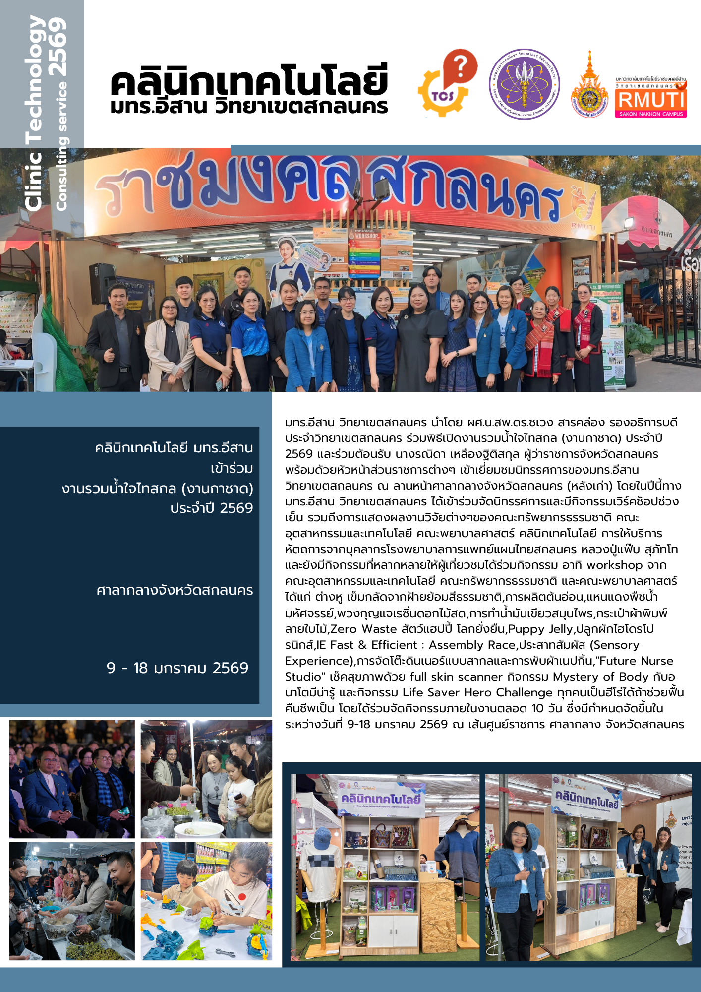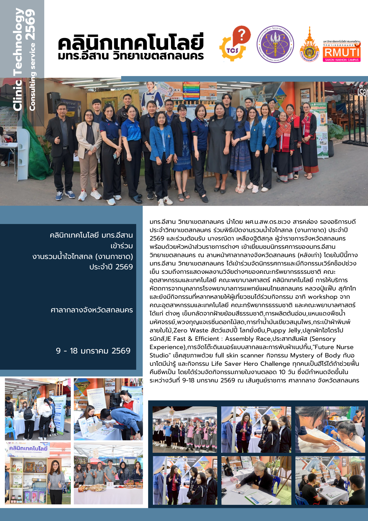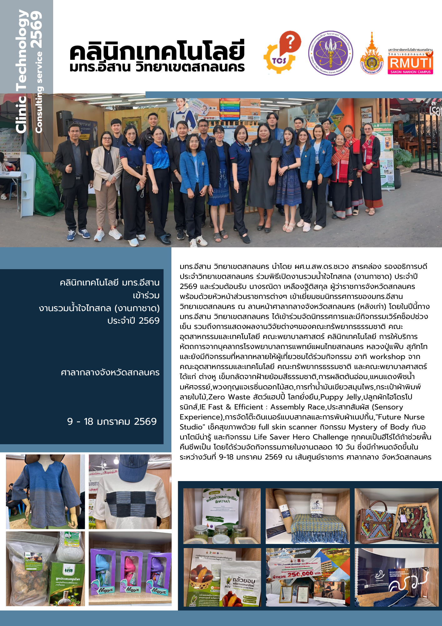คลินิกเทคโนโลยี มทร.อีสาน เข้าร่วมงานรวมน้ำใจไทสกล (งานกาชาด) ประจำปี 2569 ณ ศาลากลางจังหวัดสกลนคร  ระว่างวันที่ 9 - 18 มกราคม 2569  มทร.อีสาน วิทยาเขตสกลนคร นำโดย ผศ.น.สพ.ดร.ชเวง สารคล่อง รองอธิการบดีประจำวิทยาเขตสกลนคร ร่วมพิธีเปิดงานรวมน้ำใจไทสกล (งานกาชาด) ประจำปี 2569 และร่วมต้อนรับ นางรณิดา เหลืองฐิติสกุล ผู้ว่าราชการจังหวัดสกลนคร พร้อมด้วยหัวหน้าส่วนราชการต่างๆ เข้าเยี่ยมชมนิทรรศการของมทร.อีสาน วิทยาเขตสกลนคร ณ ลานหน้าศาลากลางจังหวัดสกลนคร (หลังเก่า) โดยในปีนี้ทาง มทร.อีสาน วิทยาเขตสกลนคร ได้เข้าร่วมจัดนิทรรศการและมีกิจกรรมเวิร์คช็อปช่วงเย็น รวมถึงการแสดงผลงานวิจัยต่างๆของคณะทรัพยากรธรรมชาติ คณะอุตสาหกรรมและเทคโนโลยี คณะพยาบาลศาสตร์ คลินิกเทคโนโลยี การให้บริการหัตถการจากบุคลากรโรงพยาบาลการแพทย์แผนไทยสกลนคร หลวงปู่แฟ๊บ สุภัทโท และยังมีกิจกรรมที่หลากหลายให้ผู้เที่ยวชมได้ร่วมกิจกรรม อาทิ workshop จากคณะอุตสาหกรรมและเทคโนโลยี คณะทรัพยากรธรรมชาติ และคณะพยาบาลศาสตร์ ได้แก่ ต่างหู เข็มกลัดจากฝ้ายย้อมสีธรรมชาติ,การผลิตต้นอ่อน,แหนแดงพืชน้ำมหัศจรรย์,พวงกุญแจเรซิ่นดอกไม้สด,การทำน้ำมันเขียวสมุนไพร,กระเป๋าผ้าพิมพ์ลายใบไม้,Zero Waste สัตว์แฮปปี้ โลกยั่งยืน,Puppy Jelly,ปลูกผักไฮโดรโปรนิกส์,IE Fast & Efficient : Assembly Race,ประสาทสัมผัส (Sensory Experience),การจัดโต๊ะดินเนอร์แบบสากลและการพับผ้าเนปกิ้น,"Future Nurse Studio" เช็คสุขภาพด้วย full skin scanner กิจกรรม Mystery of Body กับอนาโตมีน่ารู้ และกิจกรรม Life Saver Hero Challenge ทุกคนเป็นฮีโร่ได้ถ้าช่วยฟื้นคืนชีพเป็น โดยได้ร่วมจัดกิจกรรมภายในงานตลอด 10 วัน ซึ่งมีกำหนดจัดขึ้นในระหว่างวันที่ 9-18 มกราคม 2569 ณ เส้นศูนย์ราชการ ศาลากลาง จังหวัดสกลนคร